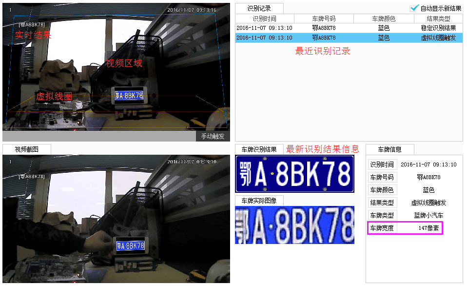 注意觀察虛擬線圈觸發的識別結果,車牌寬度值是否介于140-160之間.